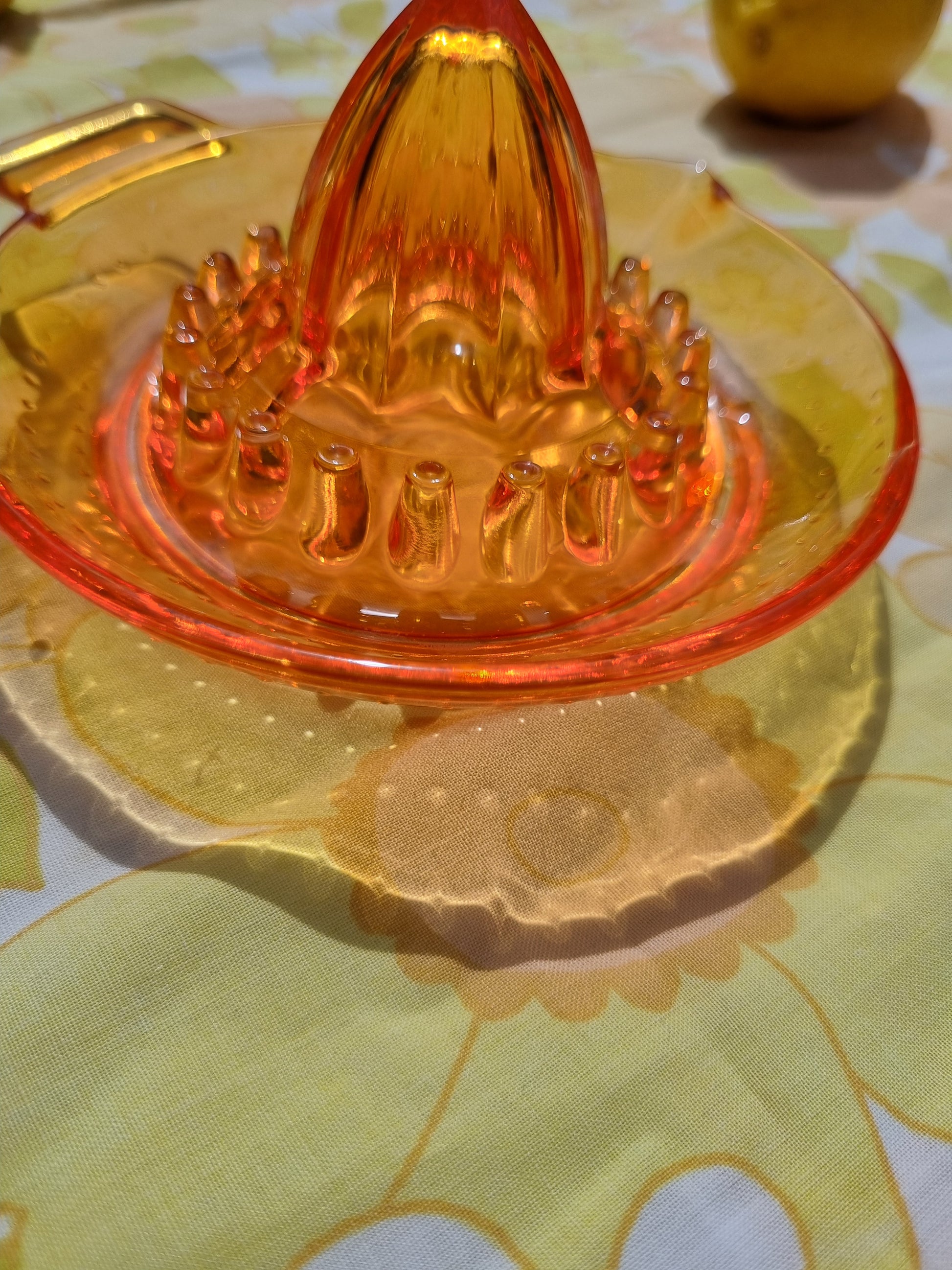 Glass lemon juicer/squeezer made by Arcoroc (yes, THAT Arcoroc) of France. In a vibrant shade of orange, it glows when hit by the sunlight. In very good, usable condition. Stunning design with little dimples around the circumference.