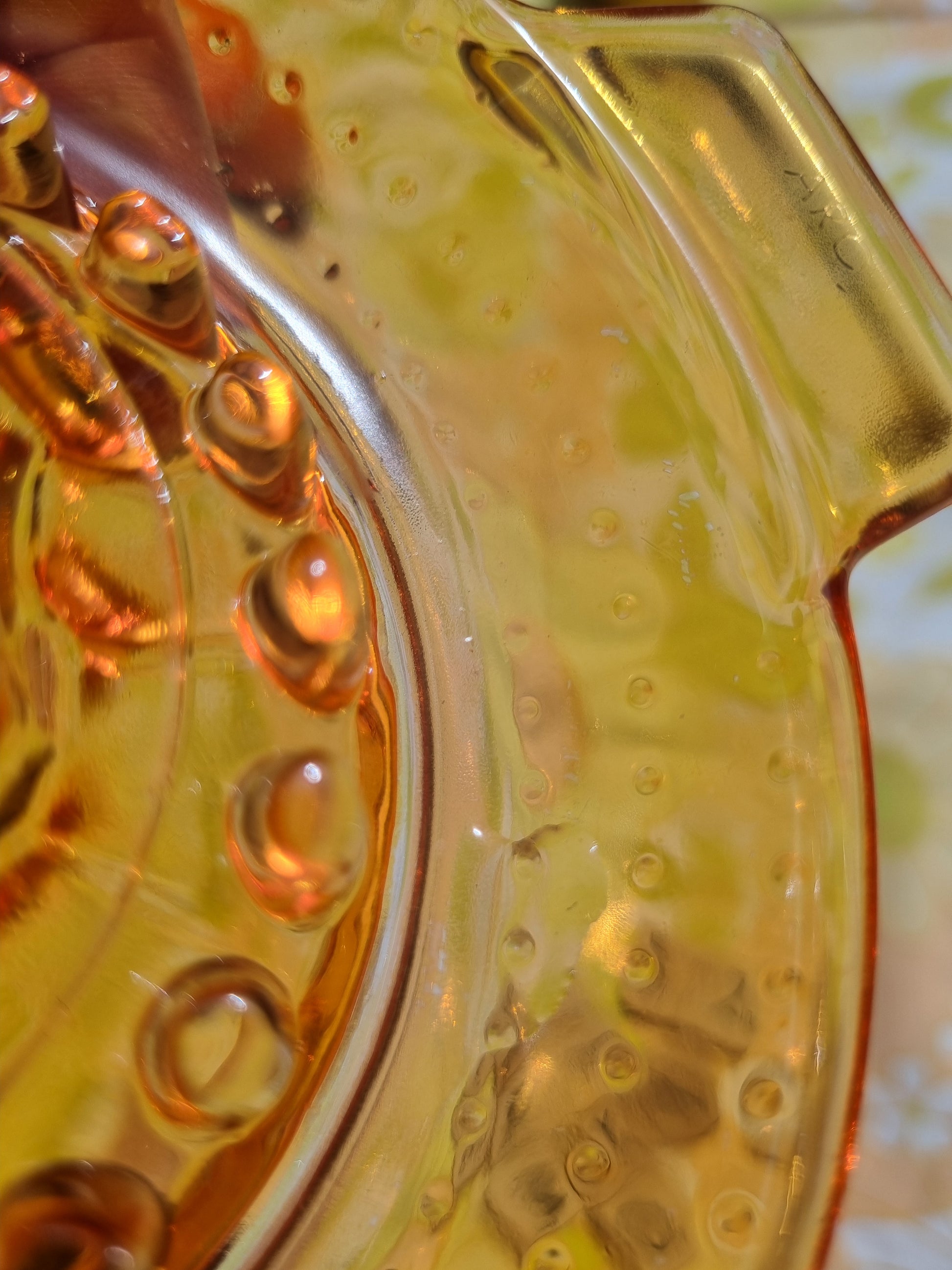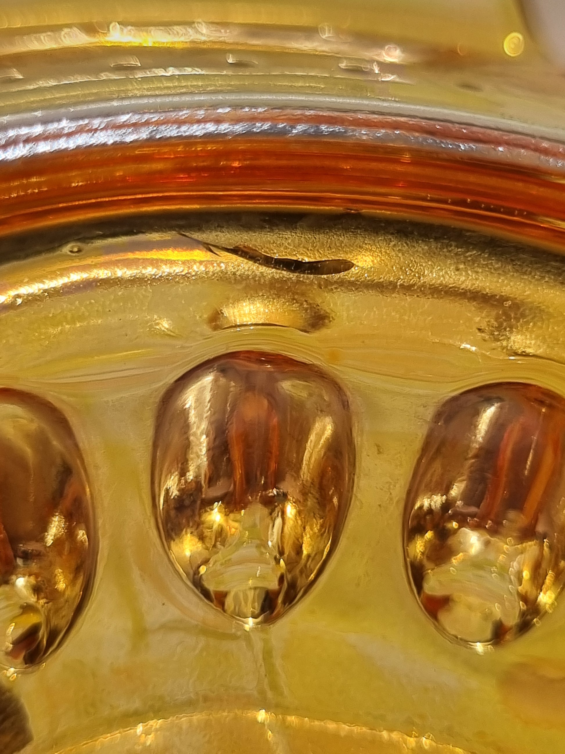 I am skeptical that the glass itself is not orange, although it appears like it is. I have photographed a few spots where the glass appears clear (not coloured). I can only find clear examples, in the same brand, online. There are no chips or cracks where you might expect them, which means it's fully functional. I have, however, photographed a couple of places where it looks like there's a small chip. When you run your finger over it (both top and bottom) it is smooth to the touch. I wonder if it's some sort of inclusion or fault, as it seems like it is inside the glass itself.