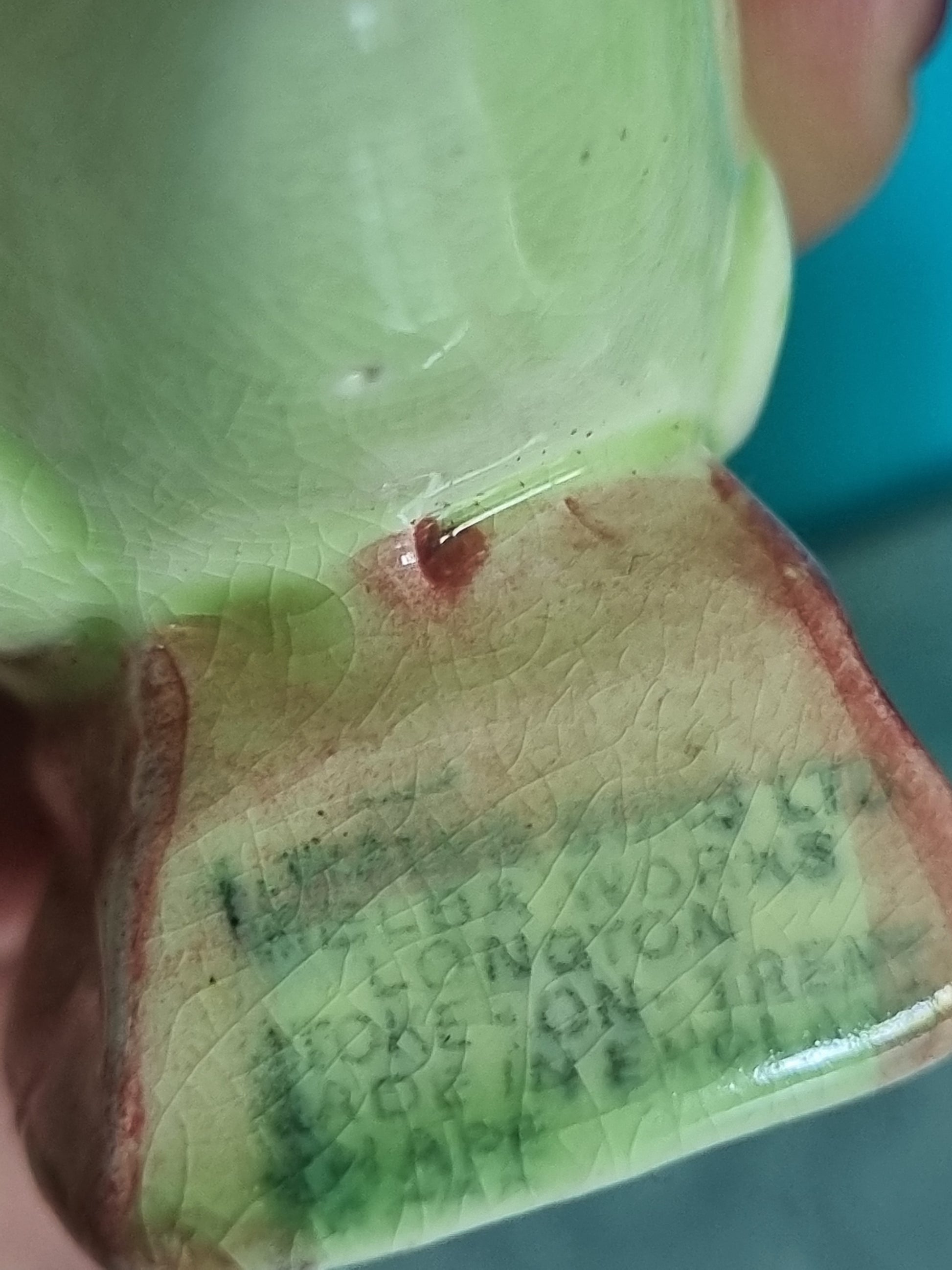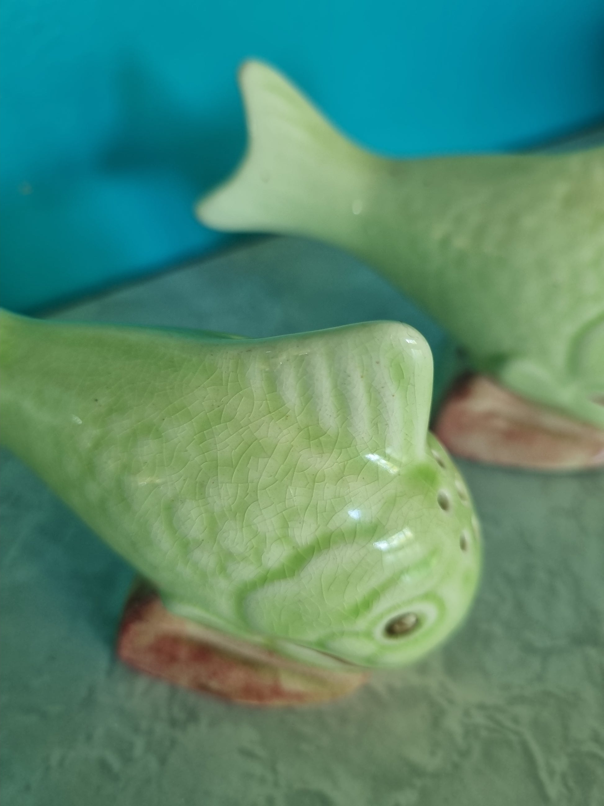 Two ceramic salt and pepper shakers - a pair of characterful green fish. Made by H Wain and Sons - Melba Ware - Longton, Stoke-on-Trent (England). In good vintage condition, with no chips or cracks, both still have their corks. There is crazing all over, however this is only noticeable upon close inspection and does not detract from their display value. Measures approximately 6 cm high and 10 cm longÂ