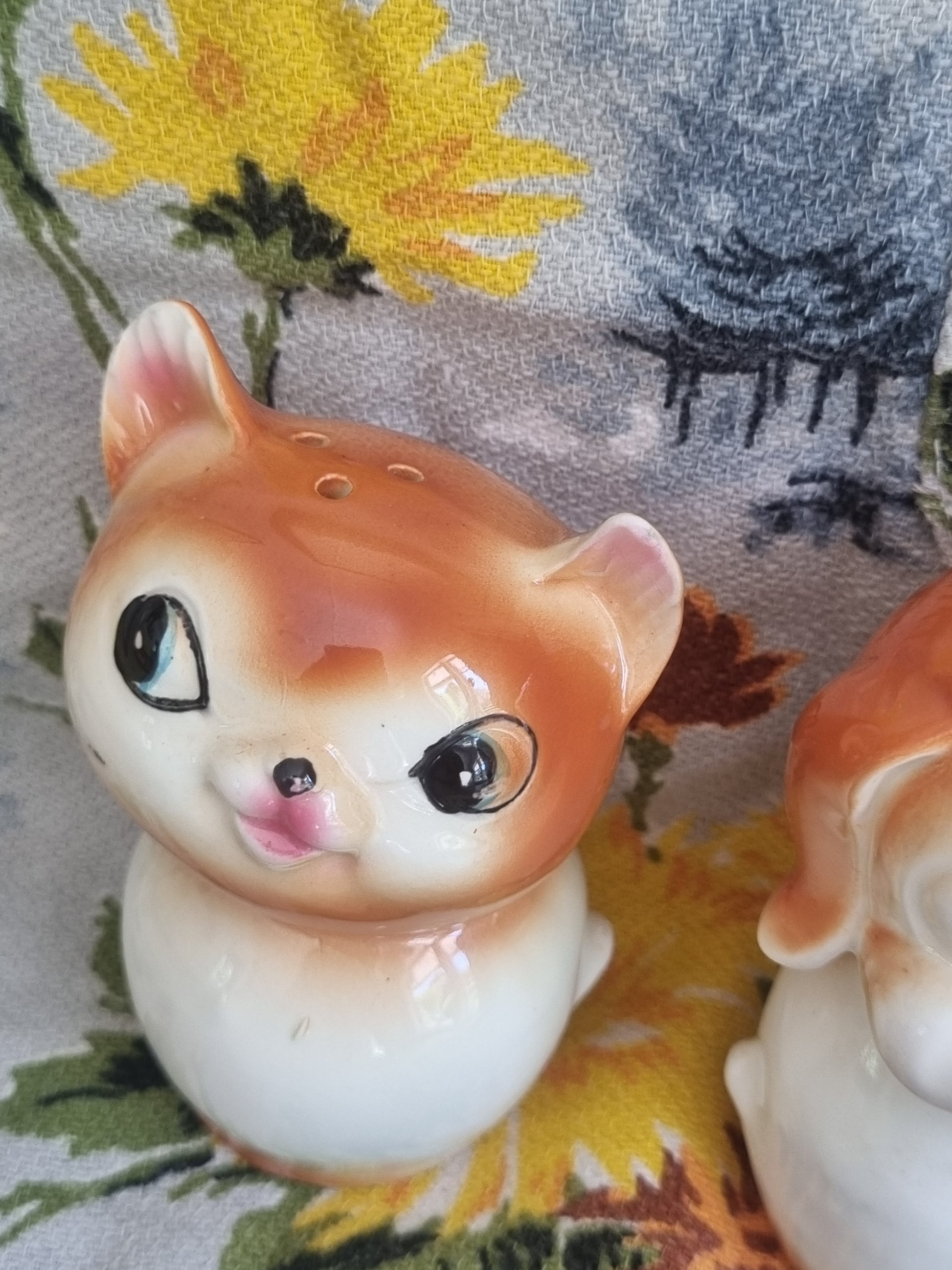 A vintage cat and dog set of salt and pepper shakers, made in Japan. Each one contains a 'voicebox' that would have originally made noise... N.B. these no longer work, and also flakes from this have fallen out onto my counter. Would not necessarily advise these be used for culinary purposes as they are. Other than that, the condition is really good for their age. No chips, cracks, or crazing. There does appear to be a few faults but they seem to be under the glaze. These measure around 8 cm tall.