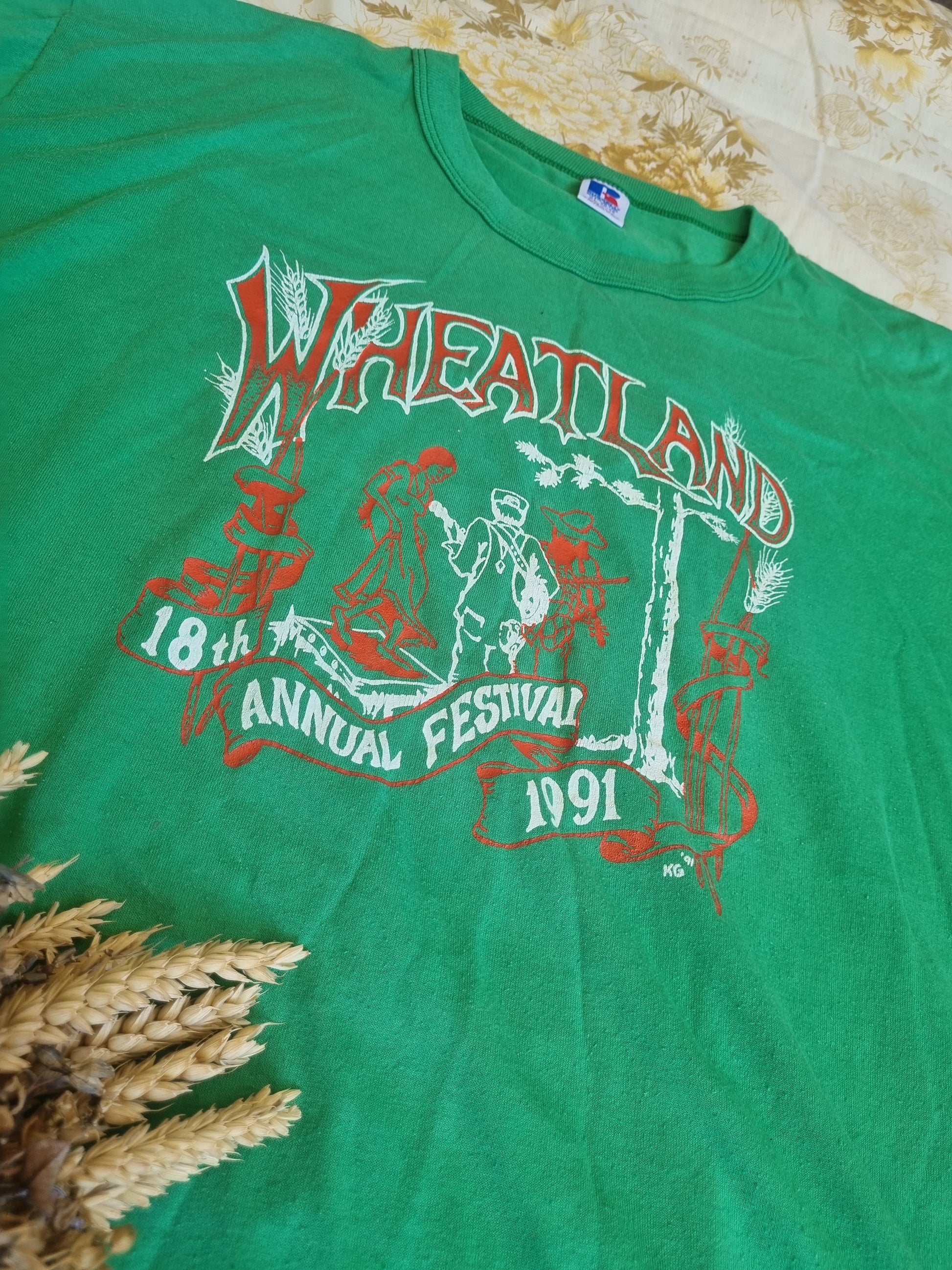 A retro t-shirt from the 18th Annual Wheatland Music Festival in 1991. This folk festival has been held in Remus, Michigan since 1974.