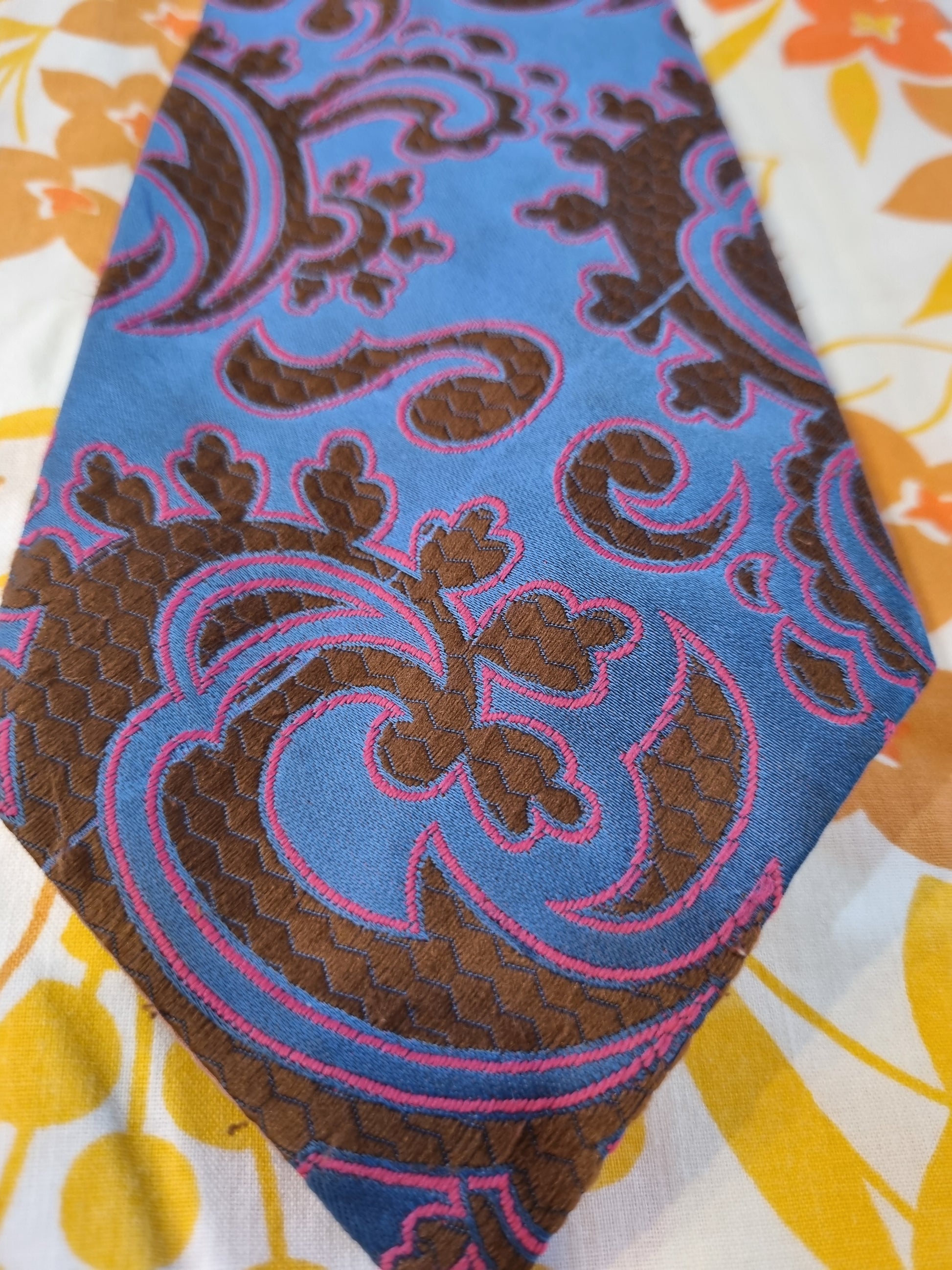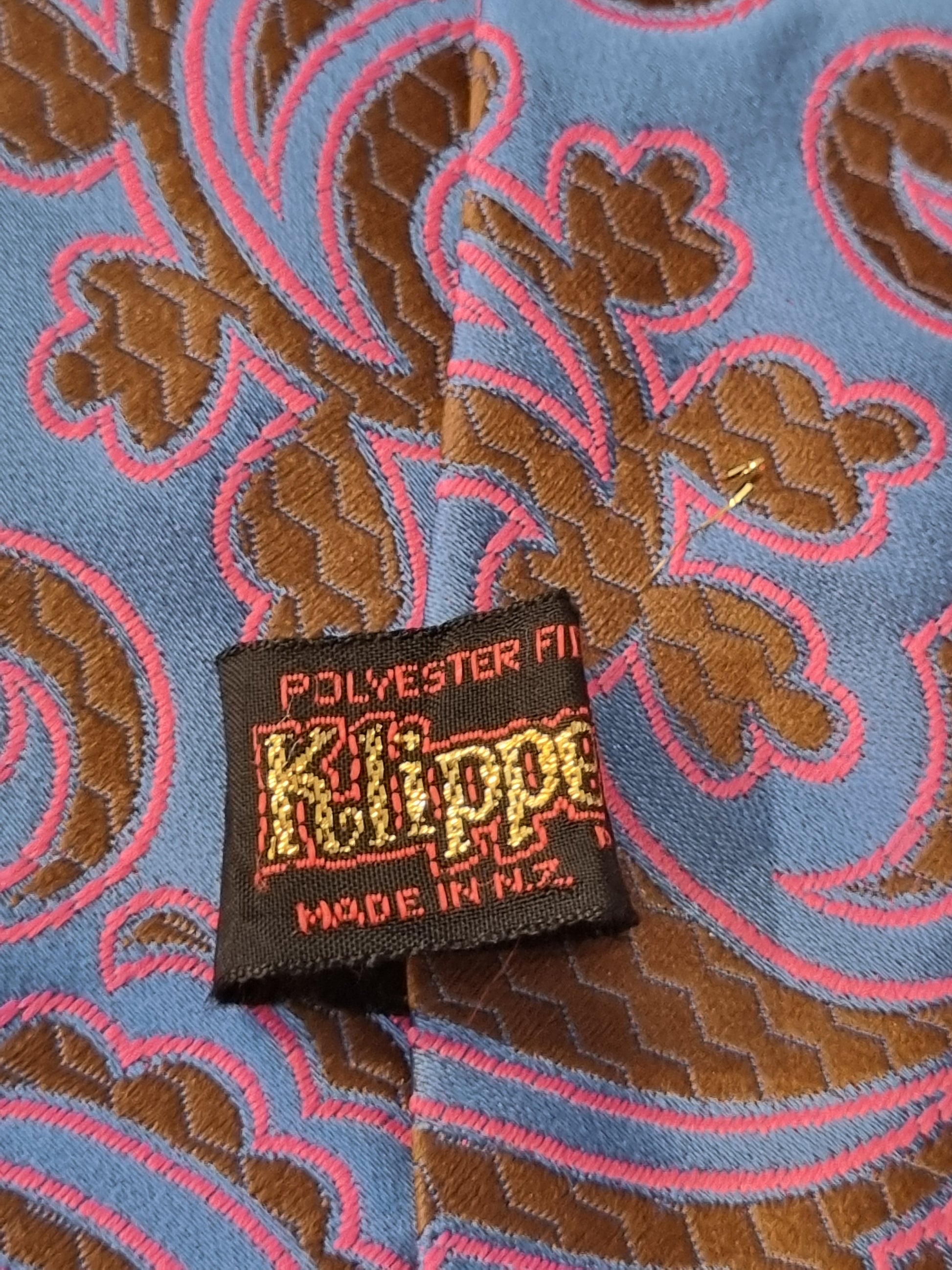 Vintage tie made by Klipper in New Zealand during the 1970s. Funky paisley-type designs in a bold brown and pink on blue background. This tie is in reasonably good vintage condition- not perfect, but not really noticeable either.